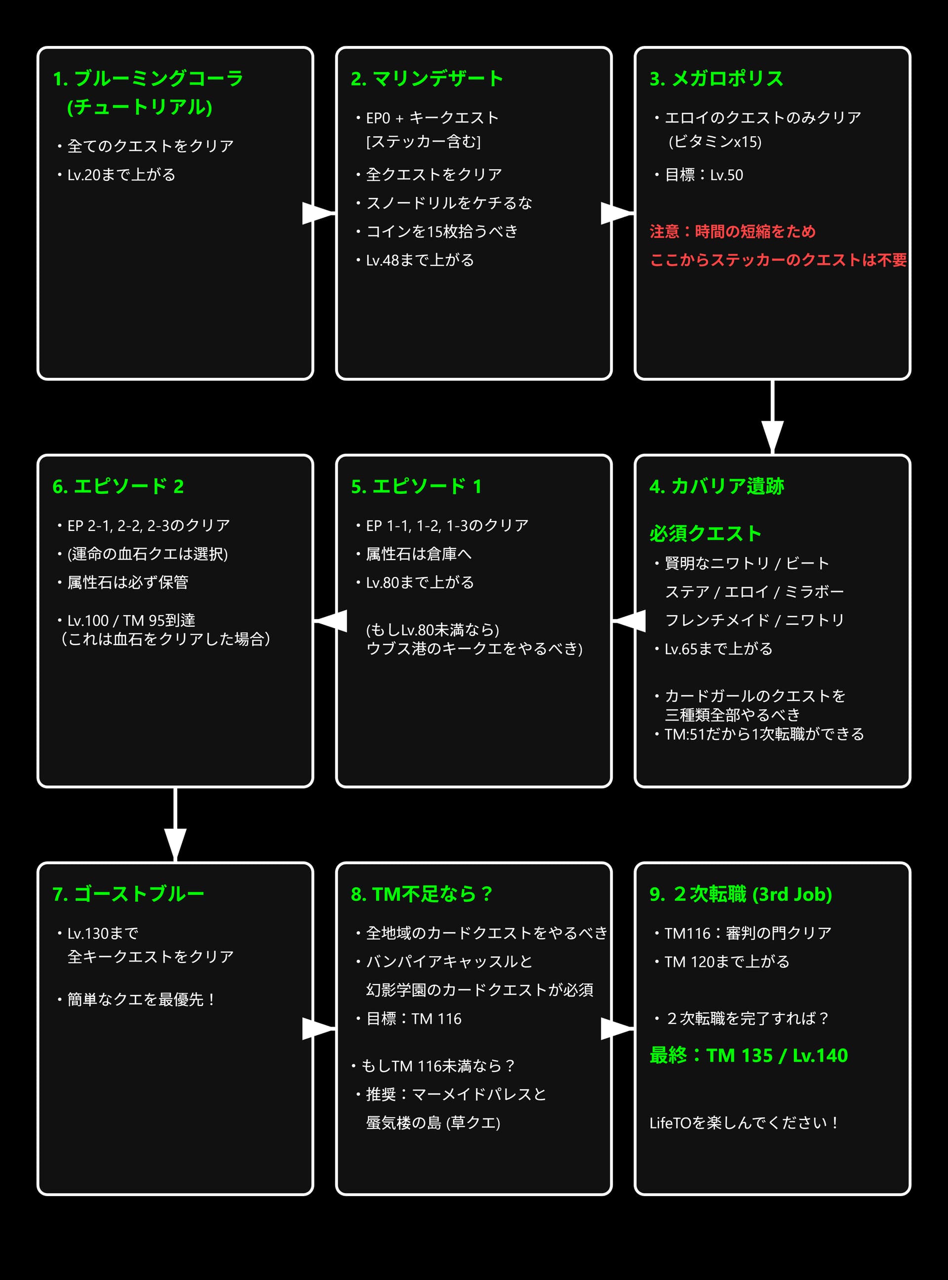 LifeTOならではの経験値・TM経験値4倍増幅(4倍レート)に特化して(クエストやエピソードにも適用)を最大限に活用し、時間を節約しましょう。